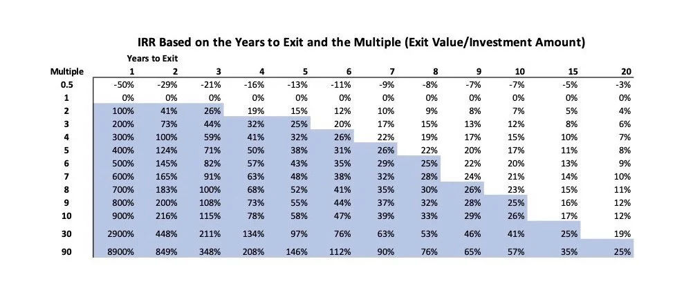 Of course, investments which have the potential to deliver high multiples can deliver sky-high returns. For example, a company which has a 90x exit in 3 years would yield a 348% annual IRR. That’s an incredible outcome, and it would make the career of any Entrepreneur. But very, very few deals produce returns of that magnitude in such a short span of time.
