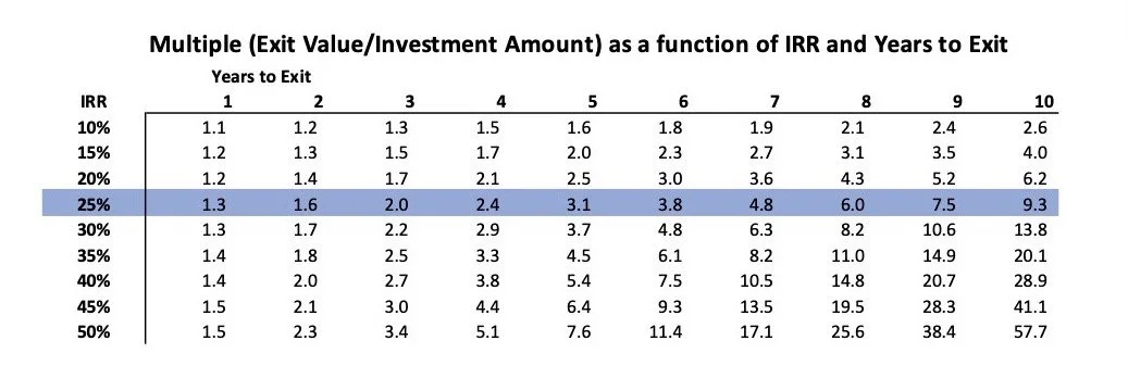 This information can help determine what a company needs to do to reach a given Required Rate of Return. The table highlights a 25% IRR target, which is a threshold some Angels and VCs use.